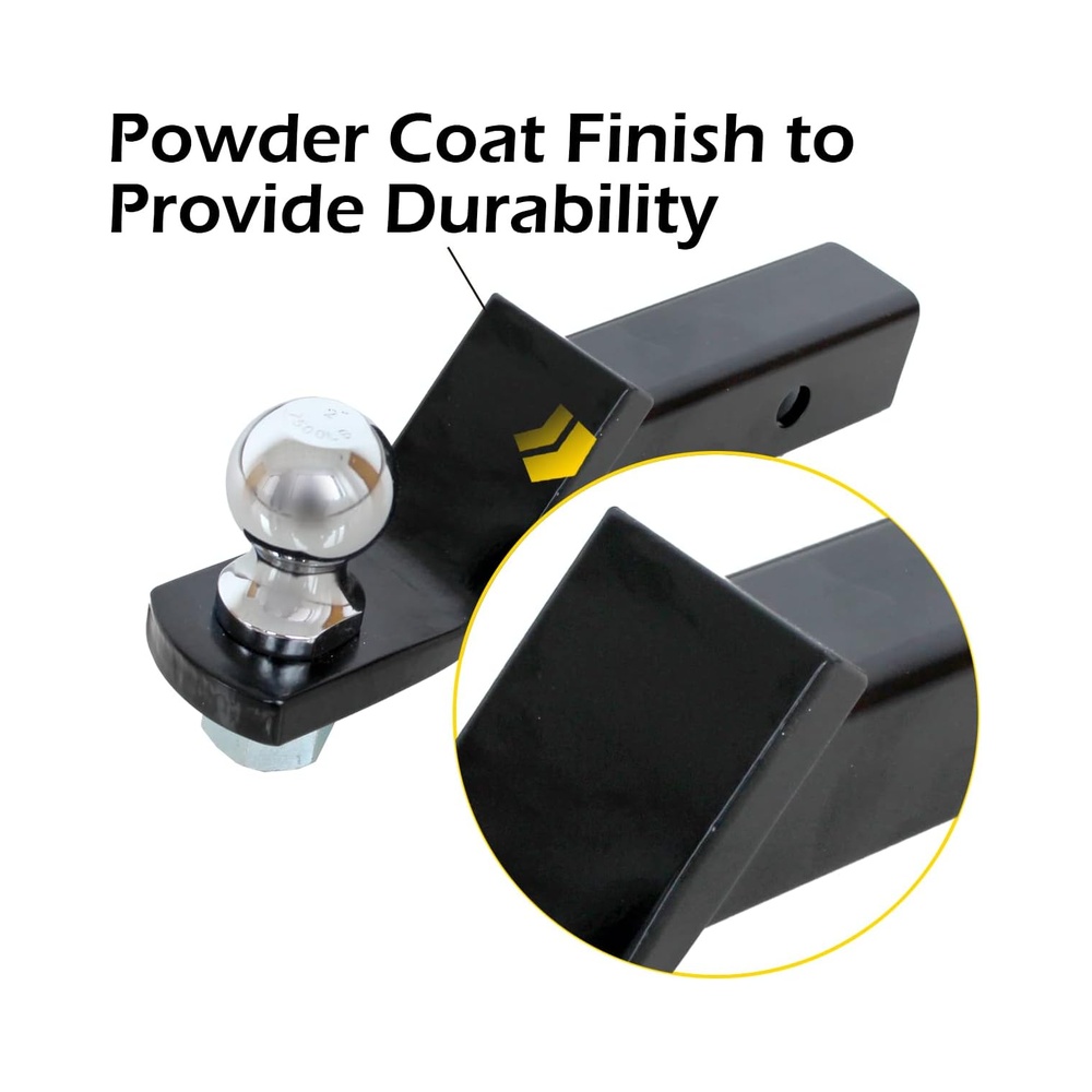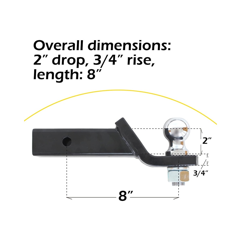 Our MaxxHaul 50547 Towing Starter Kit is ideal for multiple towing applications up to gross towing weight capacity of 7,500 lbs that offers dependability for your towing setup. It features a heavy duty welded construction that is built to last long and a weather resistant black powder coat finish to resist rust and corrosion. Premium quality towing starter kit includes: 8” long powder coated ball mount with the convenience of a maximum drop of 2” and a maximum rise of 3/4”, a 2” diameter, chrome-plated hitch ball with 1” shank, and a 5/8” pin with clip that provides reliable towing for any rugged industrial application. The solid forged hitch ball has a chrome polish finish. It fits Class III and IV standard 2” x 2” hitch receivers and supports a tongue weight capacity of 700 lbs for maximum strength. It is a perfect match for your towing needs.