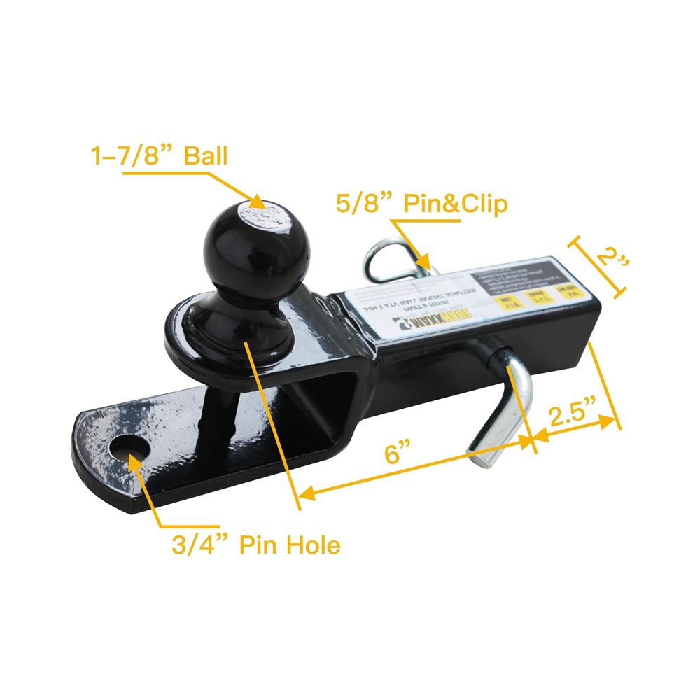 Use our MaxxHaul 50595 Hitch Ball and Winch Strap Loop to pull just about anything from your secured ATV or UTV. It features a firmly welded steel construction with powder coated finish to resist rust and damage from rain, dirt, snow, and other corrosive elements. Designed to be highly versatile offering 3 different coupling options, it equips your ATV or UTV with a standard trailer ball for complete security. The kit includes 1-7/8″” ball that is welded into place to allow your trailer to be coupled immediately, 2″” shank, 5/8″” pin hole, and 5/8″” hitch pin to securely mount to fit any class III and IV standard 2″” hitch receivers. The ball mount is equipped with a maximum weight capacity of 2,000 lbs for unparalleled strength, and the hitch ball has a 1/4″” rise to give sufficient ground clearance for ATV, UTV, lawn tractor, and trailer applications. The reinforced winch strap loop for pulling is rated up to 5,000 lbs for maximum strength. Easy to install, it offers dependability for all your towing setup needs to last pull after pull and haul after haul.