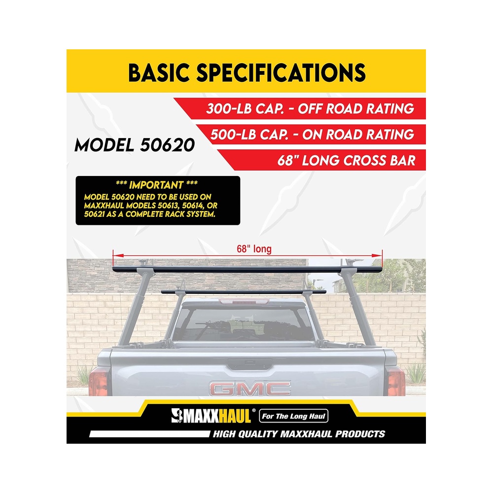Our Maxxhaul 50620 Cross Bar for Truck Rack is constructed from aluminum with a powder coat finish to withstand rust and corrosion. The rack features a crossbar length of 68″. The crossbar is designed with T-slots top and bottom for compatiblility with Maxxhaul Truck Rack Legs. The kit includes a pair of crossbars with simple installation and removal. It provides a maximum on-road rating of 500 lbs and a maximum off-road rating of 300 lbs. The cross bar for aluminum truck rack is ideal for any shop owner, home craftsman or contractor with a lot of equipment to haul for use on Maxxhaul Aluminum Truck Racks Models 50613, 50614, and 50621.