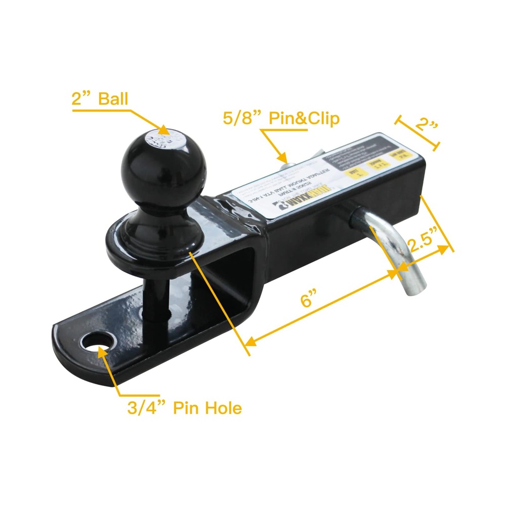 Use our MaxxHaul 50625 Hitch Ball and Winch Strap Loop to pull just about anything from your secured ATV or UTV. It is constructed from heavy duty all-steel with powder coat finish to resist rust and corrosion. It is versatile with 3 different coupling options for your ATV/UTV and includes a standard 2″ forged solid steel hitch ball. The unit includes a 1-7/8″ or 2″ hitch ball welded into place. 2″ shank with a 5/8″ hitch pin hole. The ball mount is Rated at 2,000 lbs maximum Gross Trailer Weight (GTW) and 350 lbs of Tongue Weight (TW), and the hitch ball has a 1/4″ rise to give sufficient ground clearance for ATV, UTV, lawn tractor, and trailer applications. It features a built-in winch strap loop for pulling that is rated up to 5,000 lbs. Easy to install, it offers dependability for all your towing setup needs to last pull after pull and haul after haul.