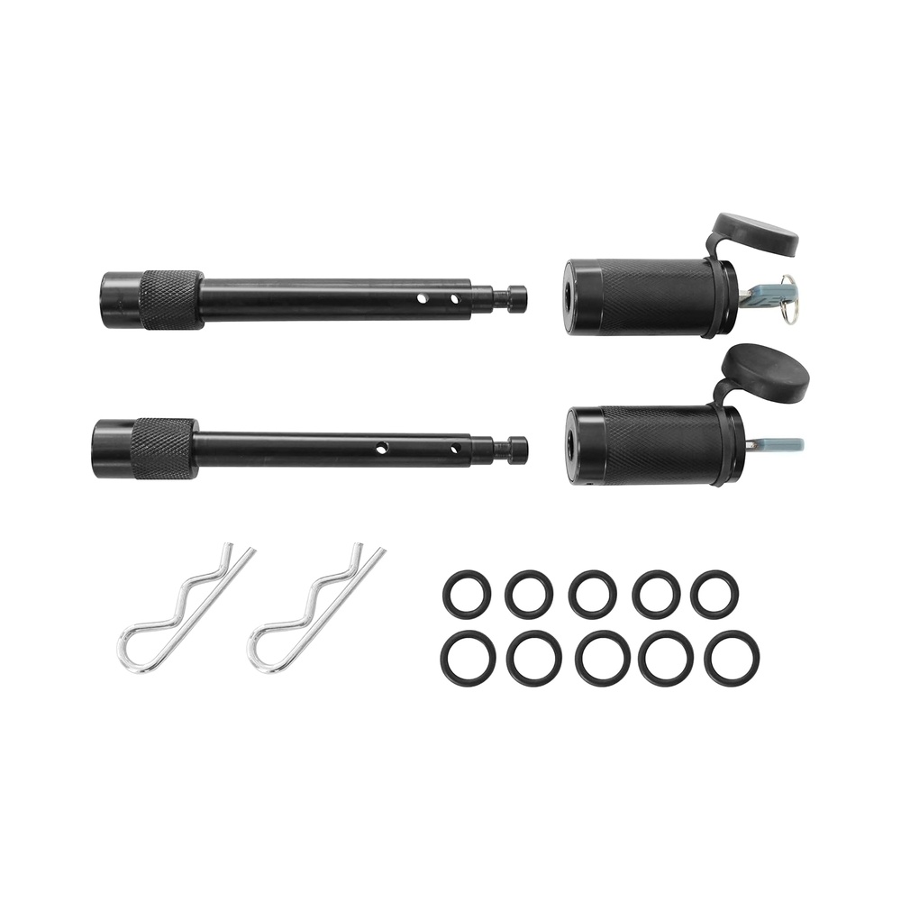 Eliminate rattle and add stabililty with the use of our MaxxHaul 50692 Hitch Lock Pin Set. This item is constructed with heavy duty steel and also has an ecoating finish to resist corrosion. One set includes both 5/8″ and 1/2″ diameter locking hitch pins with a 3-1/2″ span that can fit Class I, II, III, IV, and V or 1-1/4″ to 2-1/2″ hitch receivers. It also comes with rubber O-rings and a built-in secondary clip position to add further stability and reduce rattling. 2 clips are included to provide additional security while the product is in use. Each hitch pin features dust caps to help keep out dirt, debris, or grime that may compromise the item. The product kit includes 2 lock heads, 2 pins, 2 safety clips, 2 similar keys, 5 O-rings for the 1/2″ diameter pin and 5 O-rings for the 5/8″ diameter pin.