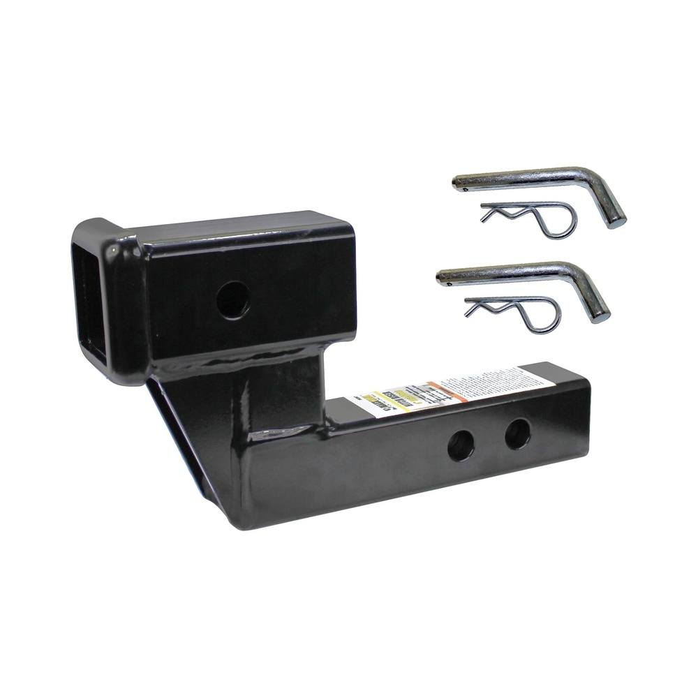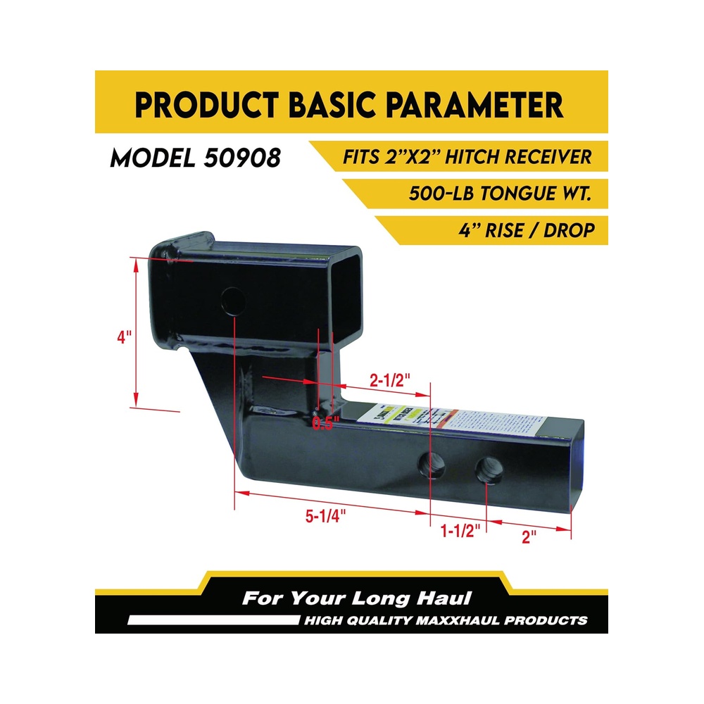 The MaxxHaul Trailer Hitch Riser (50908) is engineered to improve ground clearance and accessory alignment for vehicles equipped with 2″ hitch receivers. Offering a 4″ rise or 4″ drop, this riser helps level hitch‑mounted accessories such as bike racks, cargo carriers, and mobility platforms—especially on vehicles that sit unusually high or low. Constructed from solid alloy steel, the 50908 delivers exceptional strength and stability, supporting up to 500 lbs of tongue weight. Its black powder‑coated finish protects against rust, dust, and corrosion for long‑lasting outdoor performance. The dual pin hole design provides two shank length options—5‑1/4″ or 6‑3/4″—allowing users to fine‑tune fitment and clearance based on their vehicle and accessory setup. This riser is intended exclusively for hitch‑mounted accessories and is not designed for towing trailers. Included hitch pins ensure secure installation right out of the box. Whether you need additional height for a cargo carrier or improved alignment for a bike rack, the MaxxHaul 50908 offers a durable, reliable, and easy‑to‑install solution.