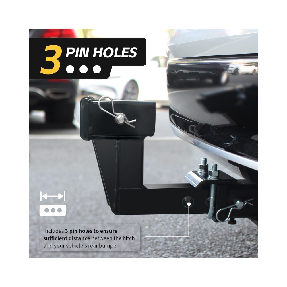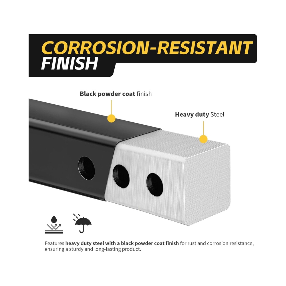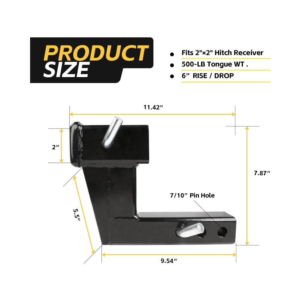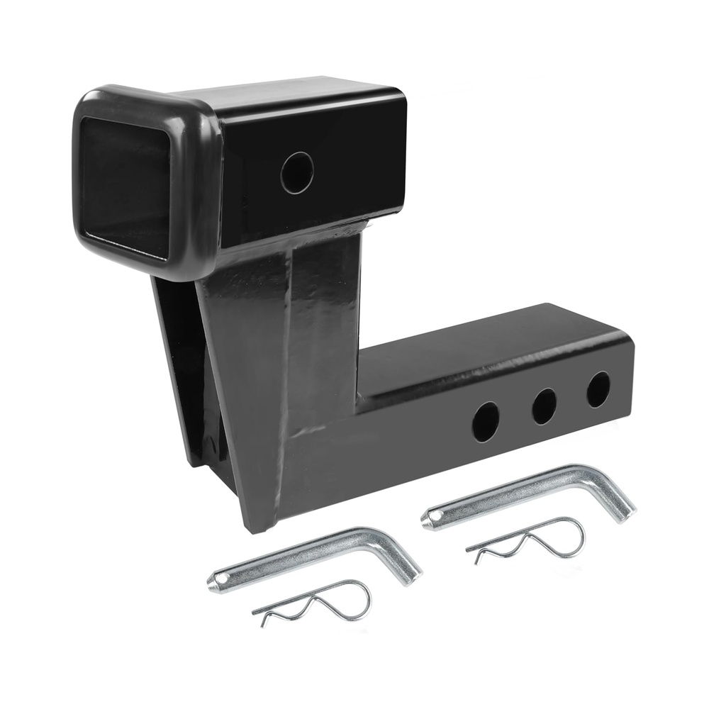 The MaxxHaul Trailer Hitch Riser (50909) is engineered to provide substantial height correction for vehicles equipped with 2″ hitch receivers. With a 6″ rise or 6″ drop, this riser helps level hitch mounted accessories such as bike racks, cargo carriers, and mobility platforms—especially on vehicles with extreme height differences that require additional clearance or alignment. Constructed from solid alloy steel, the 50909 delivers exceptional strength and stability, supporting up to 500 lbs. of tongue weight. Its black powder coated finish protects against rust, dust, and corrosion for long lasting outdoor performance. The triple pin hole design offers three shank length options, allowing users to fine tune clearance and reduce the risk of bumper contact. This riser is intended exclusively for hitch mounted accessories and is not designed for towing trailers. Included hitch pins ensure secure installation right out of the box. Whether you need additional height for a cargo carrier or improved alignment for a bike rack, the MaxxHaul 50909 provides a durable, reliable, and easy to install solution for improved ground clearance and accessory fitment.