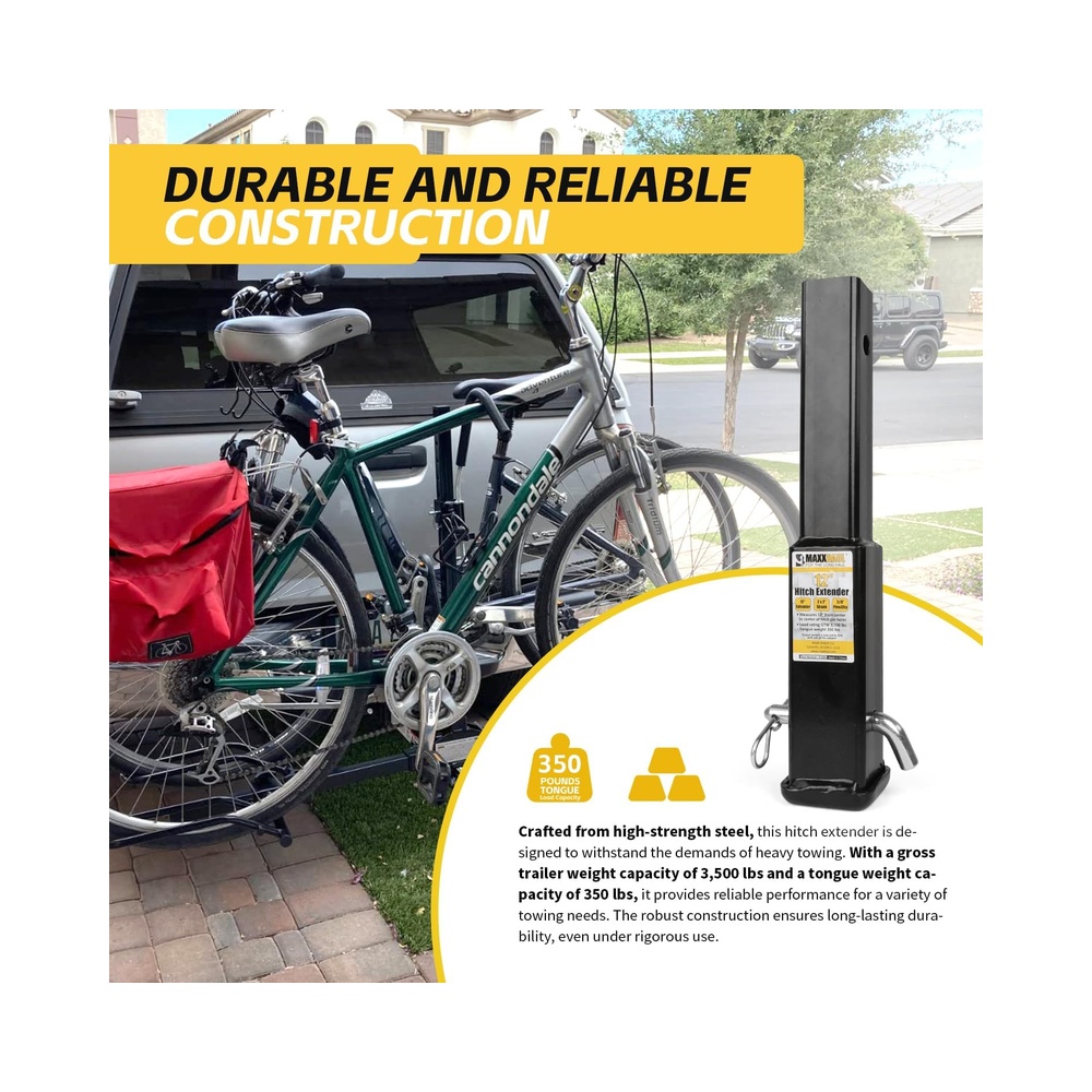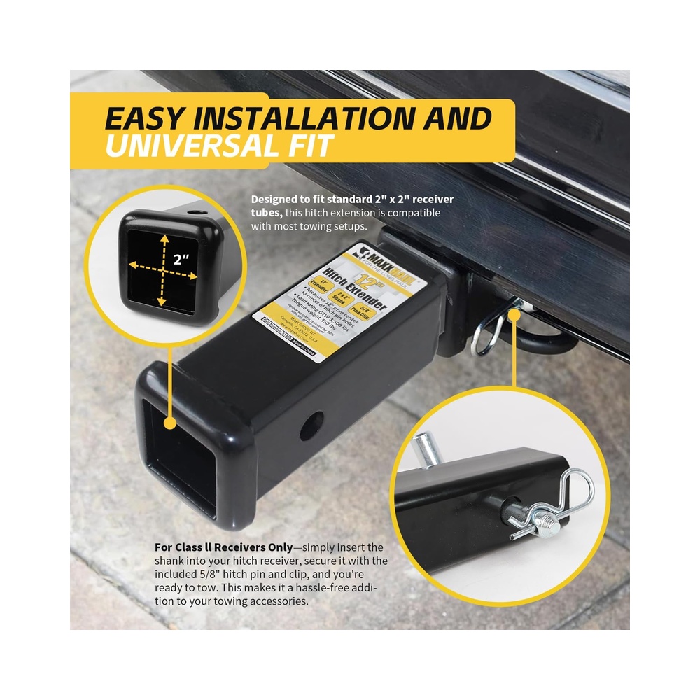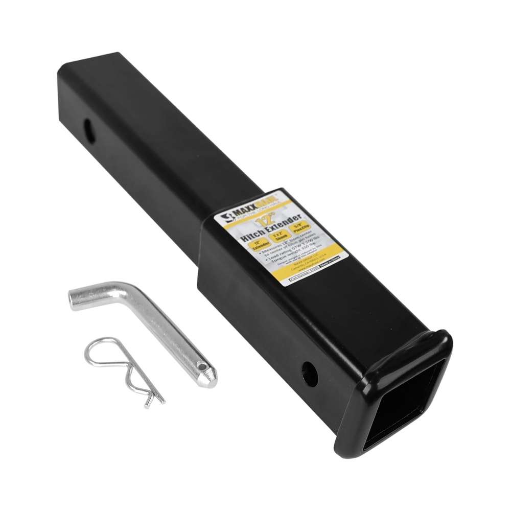 MaxxHaul is committed to providing top-quality towing accessories designed for reliability and durability. Our 12-inch trailer hitch extension offers additional clearance, making it easier to use your hitch-mounted accessories with a recessed receiver. Compatible with standard 2″ x 2″ receivers, this extension supports up to 3,500 lbs gross trailer weight and 350 lbs tongue weight. Built from strong steel and finished with a corrosion-resistant black powder coat, this hitch extender ensures long-lasting performance. Trust MaxxHaul to deliver the best in towing solutions.