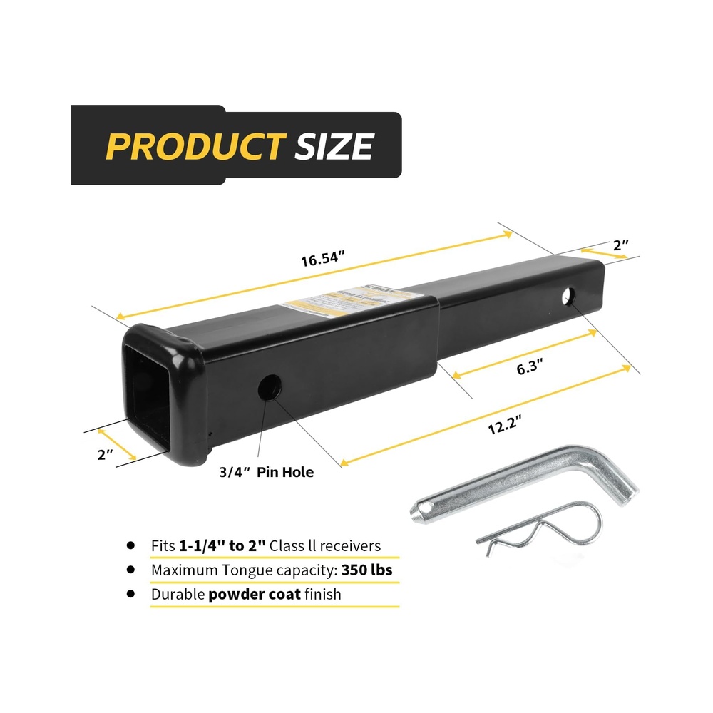 ‘[Durable and Reliable Construction]: Crafted from high-strength steel, this hitch extender is designed to withstand the demands of heavy towing. With a gross trailer weight capacity of 3,500 lbs and a tongue weight capacity of 350 lbs, it provides reliable performance for a variety of towing needs. The robust construction ensures long-lasting durability, even under rigorous use.