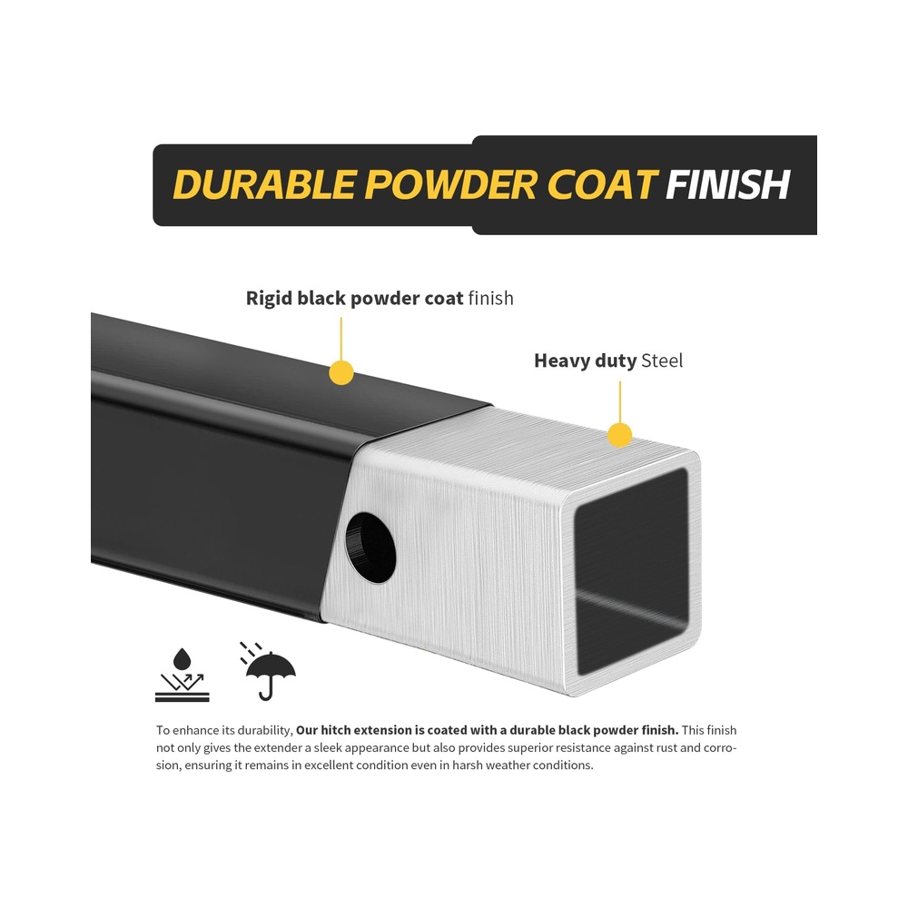 ‘[Corrosion-Resistant Finish]: To enhance its durability, the MaxxHaul hitch extension is coated with a premium black powder finish. This finish not only gives the extender a sleek appearance but also provides superior resistance against rust and corrosion, ensuring it remains in excellent condition even in harsh weather conditions.