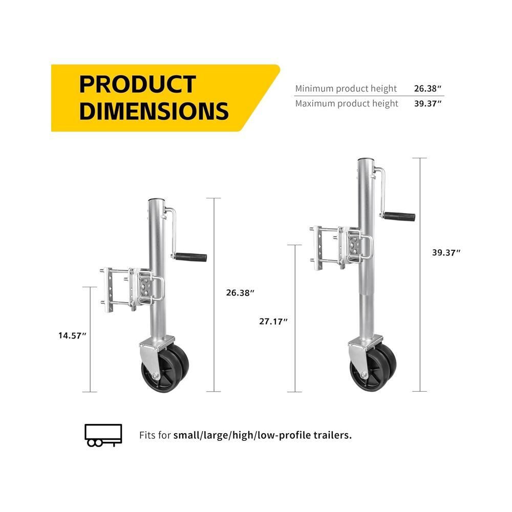 Sturdy All-Steel Construction: Crafted from heavy-duty steel and treated with a durable zinc plated finish, this trailer jack is built to withstand the elements, ensuring longevity and resistance to rust and corrosion