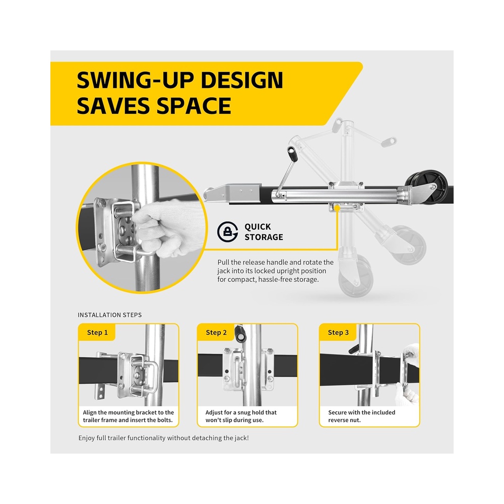 Swing Back Space Optimization: Featuring a swivel or swing back bracket, this jack can be effortlessly positioned out of the way when not in use. This design allows you to use your trailer without uninstalling the trailer jack for hassle-free operation