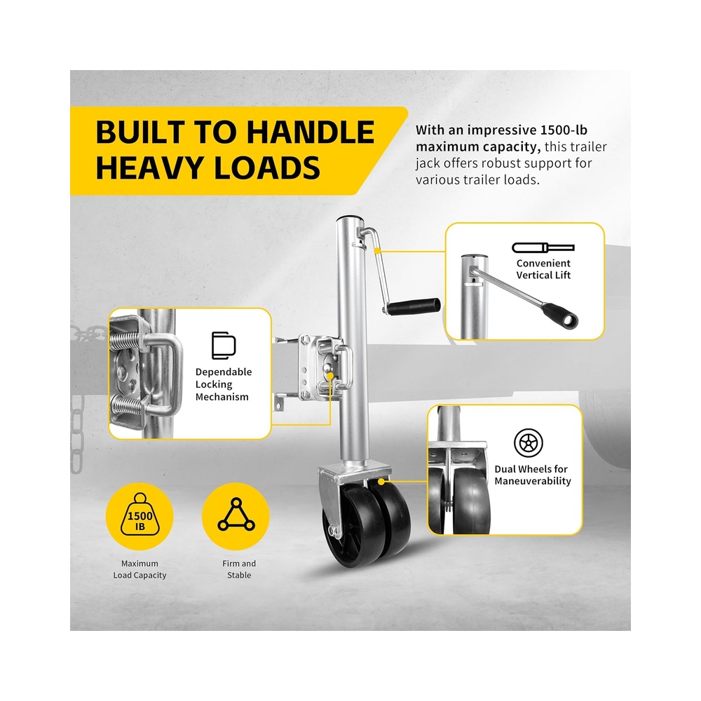 Strong Weight Capacity: With an impressive 1500-lb maximum capacity, this trailer jack offers robust support for various trailer loads, making it a reliable companion for your hauling needs