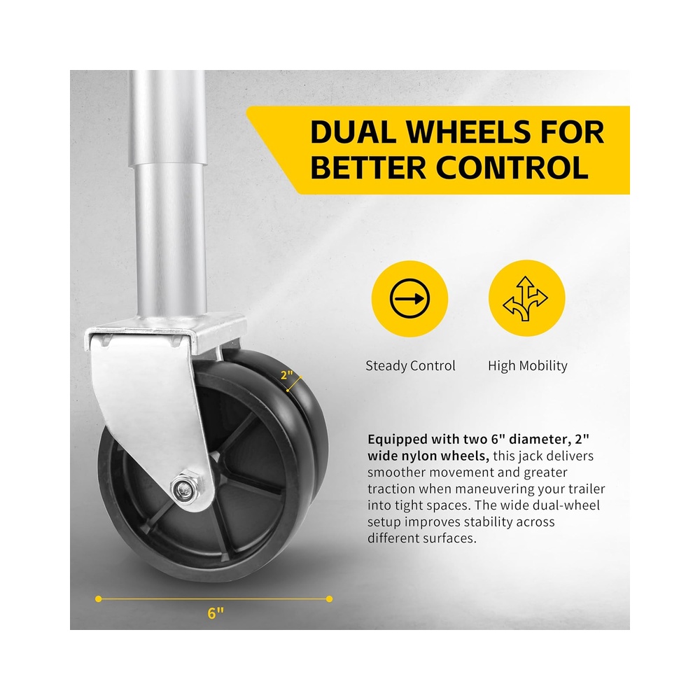 Dual Wheels for Maneuverability: Equipped with two 6″ diameter x 2″ wide nylon wheels, this trailer jack offers smooth and efficient movement. The dual-wheel configuration enhances maneuverability, even with heavier loads