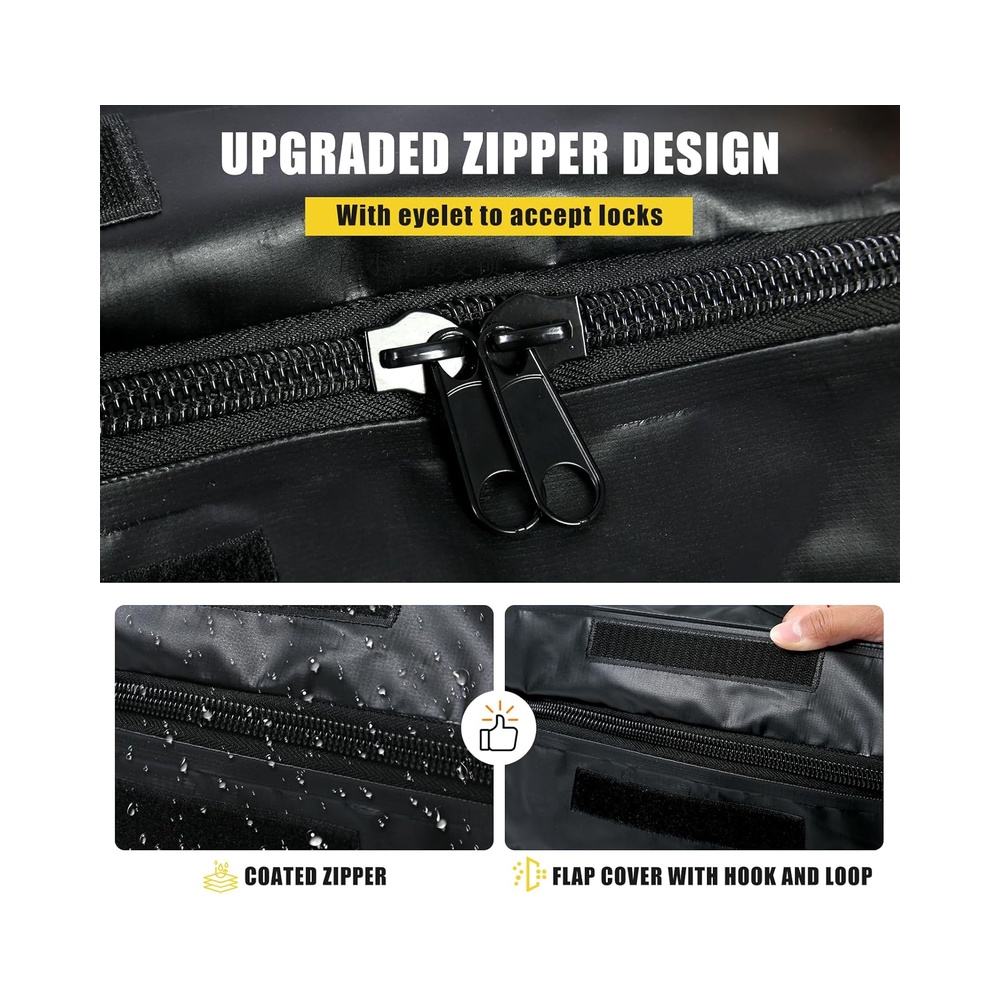 Zipper is covered with hook and loop flaps for improved water protection. Zippers come with large holes allowing use of padlocks for extra security.