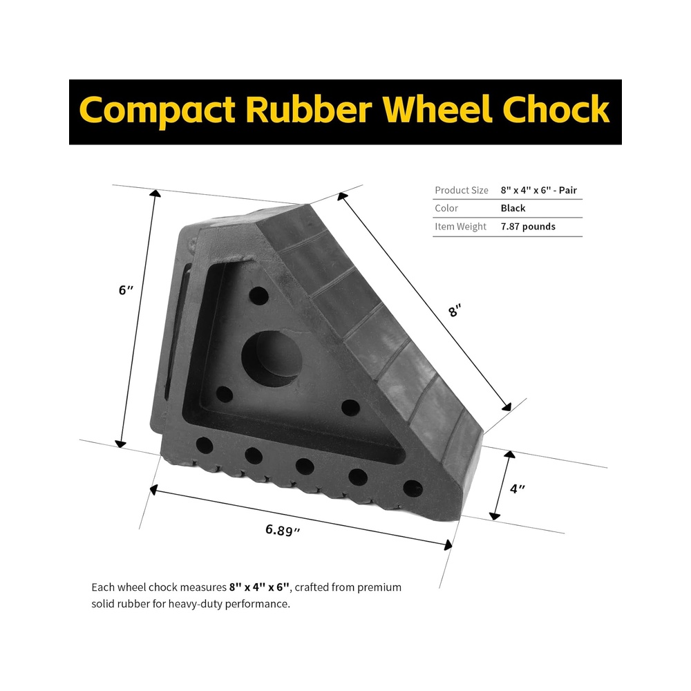The MaxxHaul Solid Rubber Wheel Chock 2-Pack (70472) provides reliable vehicle stabilization for cars, trucks, trailers, and RVs in a wide range of environments. Each chock measures 8″ x 4″ x 6″ and is molded from premium solid rubber, offering exceptional resistance to cracking, crushing, and weather-related wear. Designed for all-season performance, these chocks maintain grip on gravel, pavement, and smooth garage floors thanks to their high-traction, non-slip surface. A built-in molded handle allows fast, tool-free placement and removal, while the oil- and UV-resistant material ensures long-term durability in garages, driveways, slopes, job sites, and campgrounds. Superior to plastic alternatives, MaxxHaul 70472 delivers dependable stability and peace of mind when parking, securing, or storing vehicles for short or long-term use.